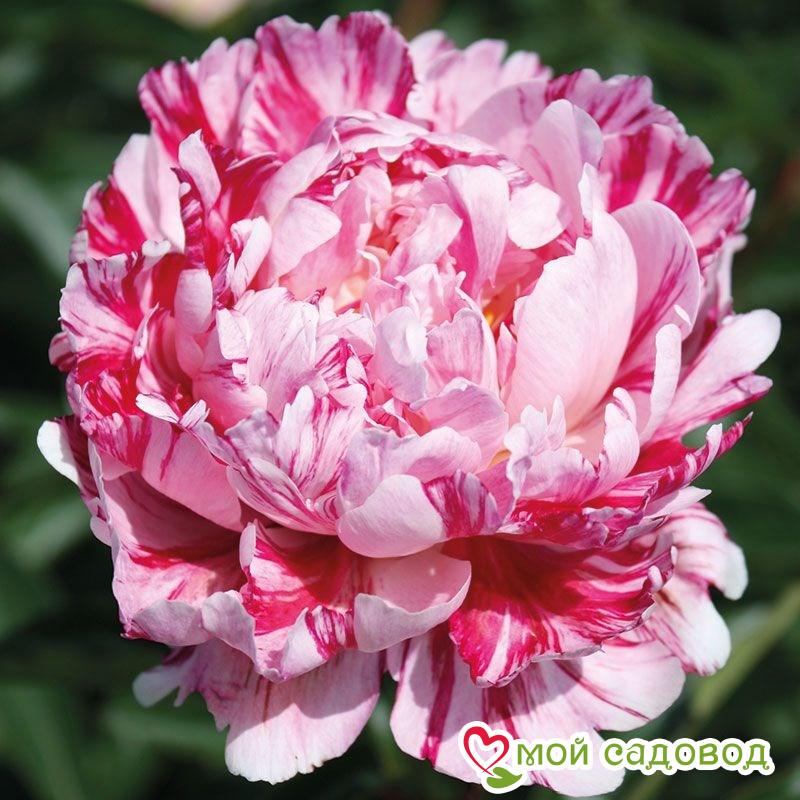Махровый шаровидный. Цветок эффектный, белый с малиново-красными полосками. Листья глянцевые, тёмно-зелёные. Высота 60-80 см. Срок цветения средне-поздний. Место посадки Для посадки пионов понадобится защищенное от ветров место с хорошей освещенностью. Сорта светлой окраски, а также пионы с простыми и полумахровыми цветками можно посадить на частично затеняемом участке, это продлит цветение и защитит цветы от выгорания. Почва для посадки Залог успешного цветения пиона в будущем — это подготовка почвы! 1. Подготовка ямы — 70*70 см на скудных песчанистых и торфянистых почвах — 50*50 см на плодородных, окультуренных почвах. ХРАНЕНИЕ ДО ПОСАДКИ: После получения посылки, рекомендуем вскрыть пакет и осмотреть корневище. Почки должны быть плотные и розового цвета. Так же уделите внимание самому корневищу, все сомнительные, потемневшие, сморщенные части удалите, а места среза обработайте зеленкой или залой. Если почки еще не тронулись в рост, а высаживать в открытый почву рано, советуем Вам хранить корневище в холодильнике, обязательно оставляя его в пакете с торфяной смесью или в коробке под снегом. Если почки успели раскрыться это не критично, сохранить до посадки их так же возможно, высадите корень пиона в большой просторный горшок или в любую другую ёмкость.