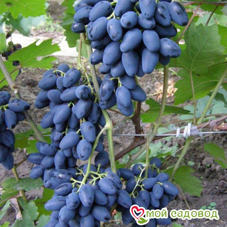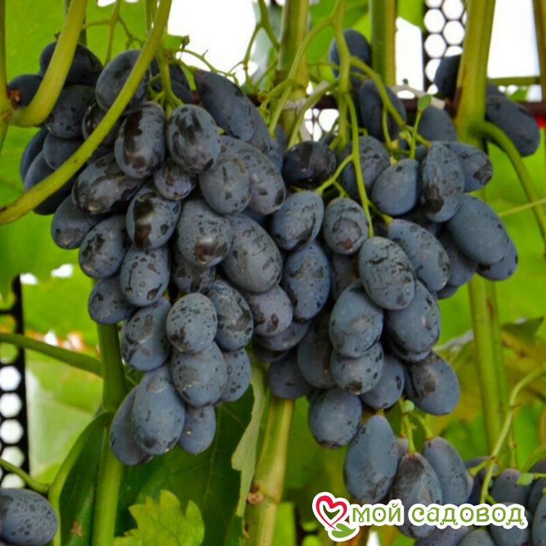 Виноград Блэк гранд – сорт канадской селекции, в зависимости от условий выращивания, урожай созревает в последних числах августа — сентябрь. Образует большие грозди, масса которых достигает до 800 грамм, но бывают случаи, когда масса может доходить до 2-3 кг. Крупные, овальные, темно-синего окраса плоды очень вкусные, сладкие, сочные с плотной кожицей, которая совсем не портит вкус ягод. Виноград Блэк гранд проявляет неплохую устойчивость к распространенным грибковым заболеваниям. Морозостойкость высокая. Магазин Мой Садовод, рекомендации по уходу Уход за виноградом сводится к регулярным поливам в сухую погоду, подкормкам и формированию куста. Для подкормки используют минеральные и органические удобрения (перепревший навоз, компост). Ранней весной кусты виноград поливают полным минеральным удобрением, растворенным в воде, перед цветением такую подкормку повторяют. Перед созреванием вносят фосфорно-калийные удобрения, а после сбора урожая проводят подкормку калием для повышения зимостойкости растений. Кроме того для лучшего вызревания лозы рекомендуется удаление пасынков и прищипывание верхушек в начале сентября. Формирование куста Винограда. Для формирования виноградных кустов необходимо установить надежную опору. Самая простая представляет собой два столба с несколькими рядами проволоки между ними. По мере роста побеги подвязывают к проволоке, задавая им нужное направление. Формирование куста винограда начинают с первого года, оставляя не более двух здоровых побегов у основания, остальные выламывают. На второй год на кусте оставляют по три почки на каждом побеге, на третий год на каждом плече оставляют 2-3 сильных побега, остальные удаляют. Пожалуйста, помните, что транспортировка и пересадка — стресс для растения. Перед высадкой в открытый грунт обработайте корневую систему стимулятором роста. С заботой о растениях, Мой Садовод. Вы можете купить саженцы винограда Блэк гранд в нашем интернет магазине недорого с доставкой на дом. Так же вас возможно заинтересуют другие сорта столового винограда: виноград августин и виноград юлиан. Если есть вопросы звоните. В нашем интернет-магазине вы сможете купить Столовые сорта Так же возможно вас заинтересуют Виноград Сенсация и Виноград Руслан